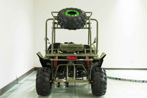 This go kart features a fully automatic transmission with reverse—no shifting necessary—allowing drivers to focus on the ride. It starts via electric ignition with a CDI system for consistent startups. Braking is handled by hydraulic disc brakes on both rear wheels, delivering dependable stopping power under load.